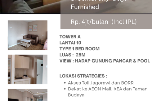 Apartemen Disewa dari 20.2sqm, yang terdiri dari 1 kamar tidur dan 1 kamar mandi berlokasi di Babakan Madang, Bogor. Fasilitasi meliputi: Swimming pool, Air conditioning, Gym, Internet, Car park, Garden, Balcony, Wi-Fi, Children's area, Equipped kitchen, Electricity, Panoramic view, Elevator, Water, Patio, Fireplace, Built-in wardrobe, CCTV, Grill, Guardhouse, Built-in kitchen, Natural gas, Office,...