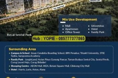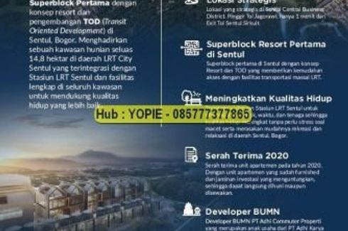 Apartemen Dijual, yang terdiri dari 2 kamar tidur dan 1 kamar mandi berlokasi di Babakan Madang, Bogor. Fasilitasi meliputi: Swimming pool, Air conditioning, Internet, Security, Car park, Garden, 24-hour security, Children's area, Electricity, Elevator dan Water.