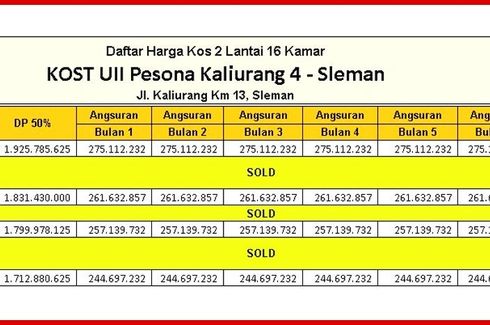 ‹ › 1/8 Komersial dijual dengan 16 kamar tidur di Sardonoharjo, Yogyakarta Sleman, Yogyakarta RP 3.4 Milyar 16 16 279 m2 Komersial Kost Dijual Jl. Kaliurang Km.13 Dekat Al-Azhar CairoSpesifikasi Kos 2 Lantai:- Luas Bangunan: 361 m²- Luas Tanah: 279 m²- 16 Kamar Tidur- 16 Kamar Mandi- Listrik: 1300 VA/Kamar- Legalitas: SHM PekaranganInfo Sekitar Lokasi :Dekat Kampus UIIDekat Kampus UGM Dekat RSU Gramedika Dekat Islam Al-Azhar Cairo " Ica Property Jogja Penjual Terverifikasi Call