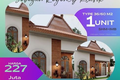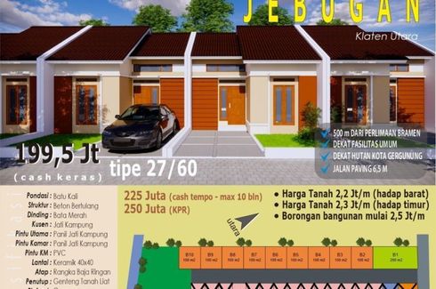 ‹ › 1/7 2 Bedroom House for sale in Jebugan, Central Java Klaten, Central Java RP 250,000,000 (RP 9,259,259 / m2) 2 1 27 m2 House Car park Garden House for sale of 27sqm, consisting of 2 bedrooms and 1 bathroom located at Jebugan, Klaten. Facilities include: Car park and Garden. Shindid Heiwa Property Call