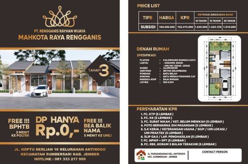 ‹ › 1/1 Rumah dijual dengan 2 kamar tidur di Antirogo, Jawa Timur Jember, Jawa Timur RP 160,000,000 (RP 5,333,333 / m2) 2 1 30 m2 Rumah Garden Rumah Subsidi Mahkota Raya RengganisRumah Subsidi Murah DP 0 rupiahtipe 30/60 free biaya biaya administrasi pajak dan balik nama. Keanu Sandita paksi Call