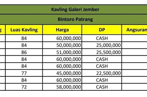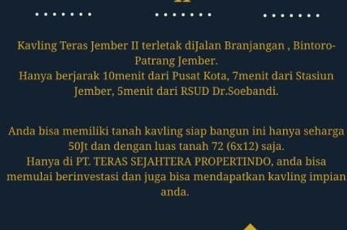‹ › 1/3 Tanah dijual dengan di Patrang, Jawa Timur Jember, Jawa Timur RP 70,000,000 72 m2 KAVLING TERAS JEMBERKavling siap bangun harga paling murah di Jember !Keunggulan Lokasi :- Hanya 10 menit dari pusat kota- Pinggir jalan aspal- Bebas Banjir- dekat pemukiman penduduk- Dekat masjid- Dekat Sekolah- Dekat Kelurahan Bintoro- Dekat RSUD. dr. SoebandiHanya tersisa 4 unit dengan harga yang terjangkau ditengah kota Jember !CP. 0823 2377 ---- Selvi - terasjember2 Call