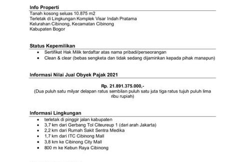 ‹ › 1/6 Land for sale in Bojong, West Java Bogor, West Java RP 4 billion 1,650 m2 Car park FOR SALE TANAH LOKASI KP PABUARAN MEKAR RT 09 RW 09 24 KEC CIBINONG KAB BOGORDETAIL TANAH :LUAS TANAH : 1.650 METERDOKUMEN : SHMHARGA PER METER : 2,4JUTATOTAL HARGA KESELURUHAN : 4MSELLING POINT :DEKAT PINTU TOLDEKAT STASIUN KRLDEKAT HALTE TRANSJAKARTADEKAT PUSAT PERBELANJAANDEKAT PUSAT PENDIDIKANDEKAT PUSAT KESEHATANAKSES MUDAH DITEMPUH DARI BERBAGAI ARAHNOTE, KAMI MENYEDIAKAN JASA : JASA DESAIN ARSITEKTUR... arie kayo Call