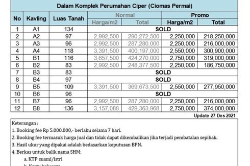 Harga rata-rata untuk tanah di Ciomas adalah RP 141,822,708. The median list price has gone diatas by 0.0% dibandingkan dengan tahun lalu. Harga rata-rata per m2 untuk tanah di Ciomas adalah RP 1,436,429 per meter persegi
