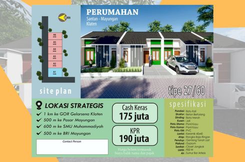 ‹ › 1/4 2 Bedroom House for sale in Mayungan, Central Java Klaten, Central Java RP 190,000,000 (RP 7,037,037 / m2) 2 1 27 m2 House Car park Garden House for sale of 27sqm, consisting of 2 bedrooms and 1 bathroom located at Mayungan, Klaten. Facilities include: Car park and Garden. Shindid Heiwa Property Call