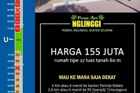 ‹ › 1/4 3 Bedroom House for sale in Nglinggi, Central Java Klaten, Central Java RP 375,000,000 (RP 6,250,000 / m2) 3 2 60 m2 House Car park Garden House for sale of 60sqm, consisting of 3 bedrooms and 2 bathrooms located at Nglinggi, Klaten. Facilities include: Car park and Garden. Anita Heiwa Property Call