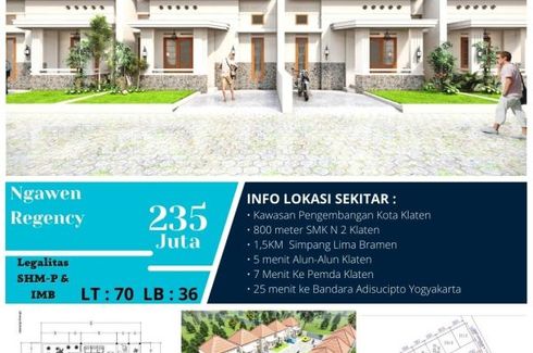 ‹ › 1/5 2 Bedroom House for sale in Senden, Central Java Klaten, Central Java RP 235,000,000 (RP 6,527,778 / m2) 2 1 36 m2 House Car park Garden House for sale of 36sqm, consisting of 2 bedrooms and 1 bathroom located at Senden, Klaten. Facilities include: Car park and Garden. Shindid Heiwa Property Call