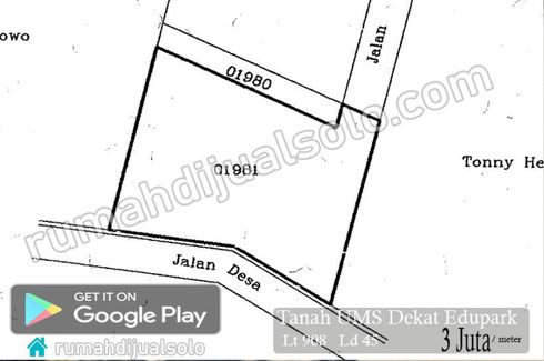 ‹ › 1/1 Land for sale in Gonilan, Central Java Sukoharjo, Central Java RP 2.6 billion 525 m2 Land for sale immediately at UMS precisely at Jalan Rajawali Raya. This land has an area of approximately 525 meters, can face two faces west and north face. the location of the land is very strategic close to the public facilities of the school's favorite famous traditional market and the campus of UMS itself.It is suitable for investment or exclusive boarding houses.Price of 5 million per meterInfo... Dimas_PRO Call