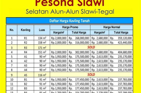 ‹ › 1/5 Land for sale in Slawi Kulon, Central Java Tegal, Central Java RP 600,000,000 360 m2 Land for sale located at Slawi Kulon, Tegal. AnamProperty Call