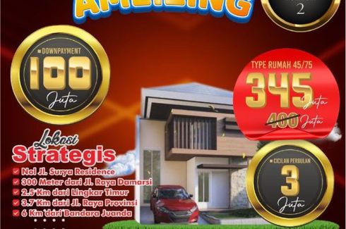 ‹ › 1/10 Rumah dijual dengan 3 kamar tidur di Bligo, Jawa Timur Sidoarjo, Jawa Timur RP 345,000,000 (RP 7,666,667 / m2) 3 1 45 m2 Rumah Security Car park Garden Children's area Video cable DIAMOND VILLAGE JUANDA 2 RUMAH MEWAH TYPE 45/75 BERADA DI KAWASAN PERUMAHAN SURYA RESIDENT DAMARSI, BUDURAN SIDOARJO MEMILIKI LOKASI SANGAT STRATEGI Ditengah2 Perumahan Dekat Minimarket Dekat Sekolahan Dekat Fasilitas Umum Akses Tidak MacetMENGAPA HARUS DIAMOND VILLAGE JUANDA 2 ? Nol Jalan Surya Resident 300 meter dari Jalan Raya Damarsi 2,5 km dari Jalan Raya Lingkar Timur 3,7 km dari... Novia Shinta Call