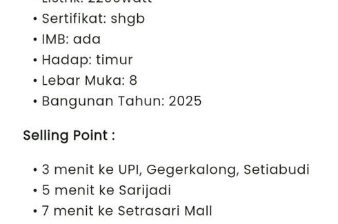 ‹ › 1/15 5 Bedroom House for sale in Geger Kalong, West Java Bandung, West Java RP 3.9 billion 5 4 360 m2 House Dijual Rumah Siap Huni di Cluster Gegerkalong Setiabudi Fasilitas :- One Get System - Lingkungan Aman & Nyaman- Taman Depan & Belakang Rumah- Kolam Renang- 1,5 KM ke Jalan Utama Setiabudi - 1,9 KM ke Kampus UPI- 4,1 KM ke PVJ Mall- 5 KM ke Pasteur Maranatha Spesifikasi :> Jumlah Lantai : 2 Lantai > Luas Tanah : 360 m2> Luas Bangunan : 351 m2> Orientasi Hadap : Barat- Lebar Muka : -/+ 15 meter> Kamar... Abdillah Pakar Mulia Verified seller Call