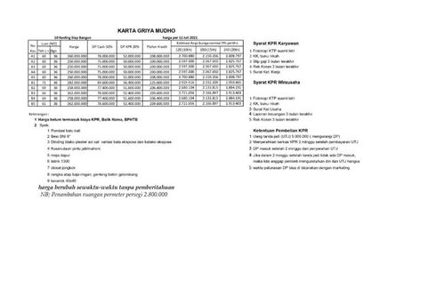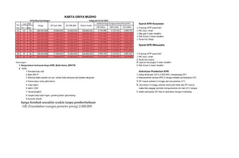 ‹ › 1/11 Rumah dijual dengan 2 kamar tidur di Kemudo, Jawa Tengah Klaten, Jawa Tengah RP 250,000,000 (RP 6,944,444 / m2) 2 1 36 m2 Rumah Air conditioning Gym Security Car park Garden Children's area Panoramic view Miliki segera dan dapatkan harga promo pebeli pertama, hanya 250 juta anda sudah mendapatkan Rumah dengan type 36m2 luas tanah 60m2 yang dengan lokasi yang sangat dekat dengan SMP N 1 Prambanan, Survey segera selagi harga masih promo Karta Griya Mudho 250jtLegalitas SHM+IMBSiap KPRHarga: Rp. 250.000.000Alamat : Kemudo, Prambanan, KlatenSpesifikasiLuas tanah : 60 m2Luas Bangunan : 36 m22 Kamar Tidur... Anita Heiwa Property Call