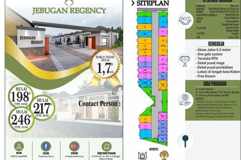 ‹ › 1/6 Tanah dijual dengan di Jebugan, Jawa Tengah Klaten, Jawa Tengah RP 199,500,000 105 m2 Security Car park Garden Punya Tanah Kavling Cocok Untuk Tabungan Hari Tua, Investasi Jangka Pendek dan Bisa Di Bangun Rumah Siap Huni Sesuai Keinginan Anda.Jebugan Regency Alamat: Jebugan, Klaten Utara, KlatenHarga 199,5 JutaSHM+IMBSiap BangunLuas Tanah : 105m2Akses Jalan 6,5 meter Mobil Papasan LeluasaOne Gate System24 Jam Security*Selling Point:✅ 200 Meter Dari Jl Raya Ki Ageng Pamenahan✅ 400 Meter Dari Hutan Kota... Dilla Heiwa Property Call