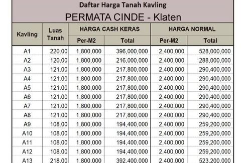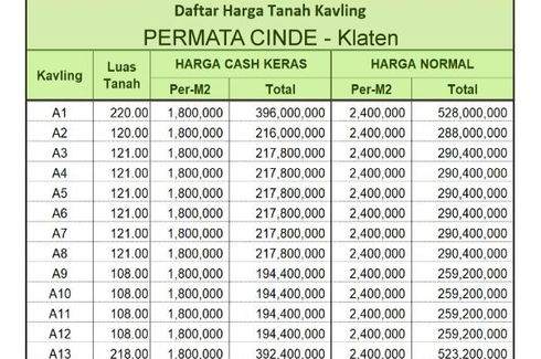 ‹ › 1/3 Tanah dijual dengan di Jetis, Jawa Tengah Klaten, Jawa Tengah RP 128,000,000 80 m2 Punya Tanah dulu lebih baik ketimbang masih ngontrak terus. Terpenting punya aset yang aman dan nilai naik terus. Apalagi Tanah kavling di area Bekasi kota. Aksesnya bagus, mudah dan lancar. Pun harganya masih rendah, lagian belinya ada DISKON 25% langsung.Info Sekitar Lokasi :-Dekat Kantor Kecamatan Klaten Selatan-Dekat Kantor PEMDA Klaten-Dekat RS dr. Soeradji Tirnonegoro KlatenKeuntungan :-Legalitas... KPTI Call