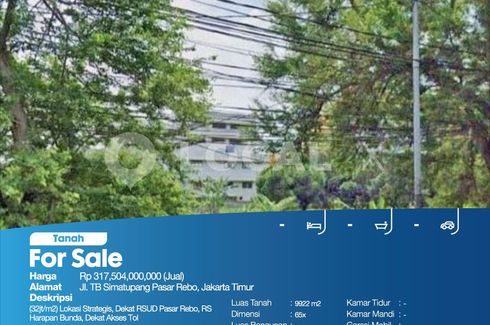 (Rp32jt/m2) Lokasi Strategis, Dekat RSUD Pasar Rebo, RS Harapan Bunda, Dekat Akses TolFor Sale - JualTanah Jl. TB Simatupang Pasar Rebo, Jakarta TimurHarga. Rp 317,504,000,000 (Jual)Deskripsi Properti. (Rp32jt/m2) Lokasi Strategis, Dekat RSUD Pasar Rebo, RS Harapan Bunda, Dekat Akses TolLuas Tanah. 9922 m2Dimensi. 65xLuas Bangunan. m2Sertipikat. SHMKamar Tidur. -Kamar Mandi. -Garasi Mobil. -Hadap /...