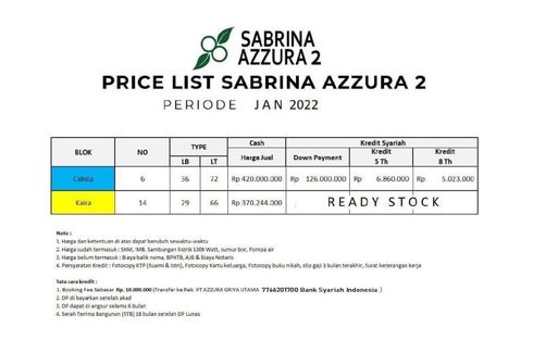 ‹ › 1/10 Rumah dijual dengan 2 kamar tidur di Cijengkol, Jawa Barat Bekasi, Jawa Barat RP 399,000,000 (RP 11,083,333 / m2) 2 1 36 m2 Rumah Setelah sold out dengan proyek pertama "Sabrina Azzura" Kini, developer PT. Azzura Griya Utama kembali dengan proyek ke 2 di Setu Bekasi yaitu "Sabrina Azzura II"======================Dengan skema Syariah:• Tanpa Bank• Tanpa Riba• Tanpa Bunga• Tanpa Denda • Tanpa Sita• Tanpa Akad Bathil=========================Fasilitas perumahan:- Masjid di dalam cluster- Rumah penghafal Al Qur'an- Lapangan... Atang Shanjaya Call